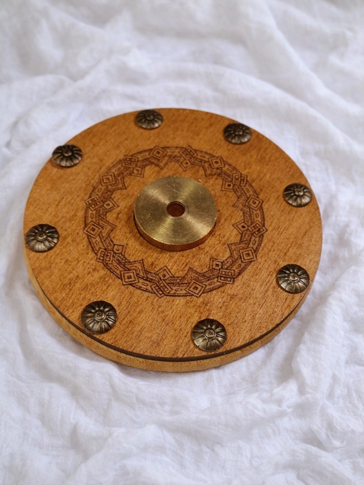 Świecznik wykonany z naturalnego drewna, wyposażony w centralny wkład z mosiądzu (metal odporny na wysoką temperaturę), przeznaczony do umieszczania świec cienkich, w tym świec cerkiewnych i rytualnych. Produkt służy do stabilnego podtrzymywania świecy podczas jej spalania. Nie jest produktem zabawkowym ani dekoracyjnym bez funkcji – świecznik pełni funkcję użytkową związaną z bezpiecznym spalaniem świec.