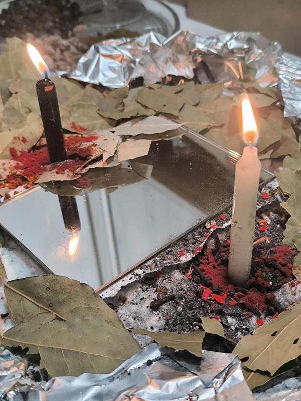 Kolejny etap to przygotowanie ołtarza: ustawiam wszystkie potrzebne elementy, dobieram akcesoria zgodne z intencją, odpowiednie ofiary (dary), przygotowuję składniki, oleje, zioła i świece. Jeśli pracuję na świecach figuralnych – zostały one wykonane wcześniej, ręcznie, z uwzględnieniem celu rytuału, co również wymagało czasu i uwagi.